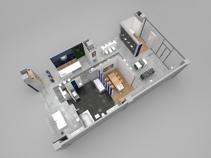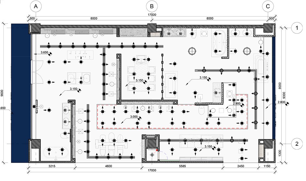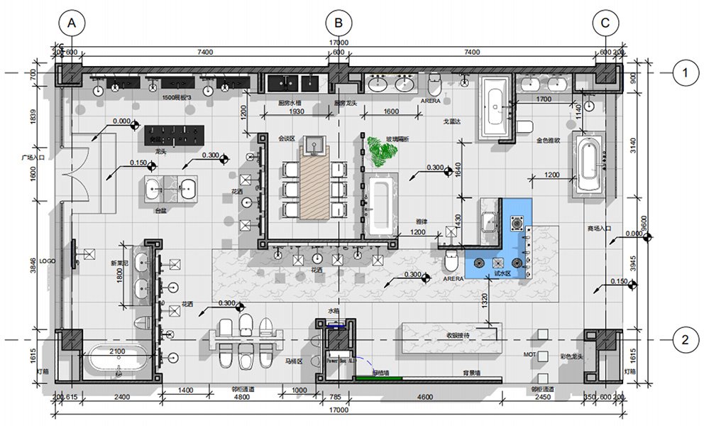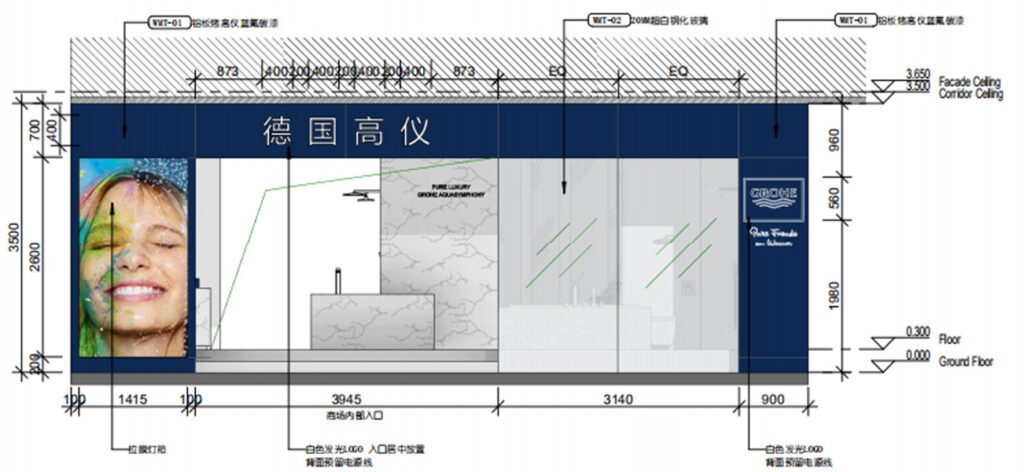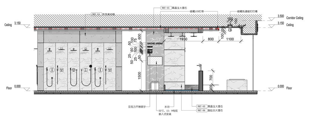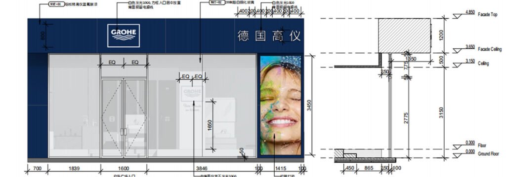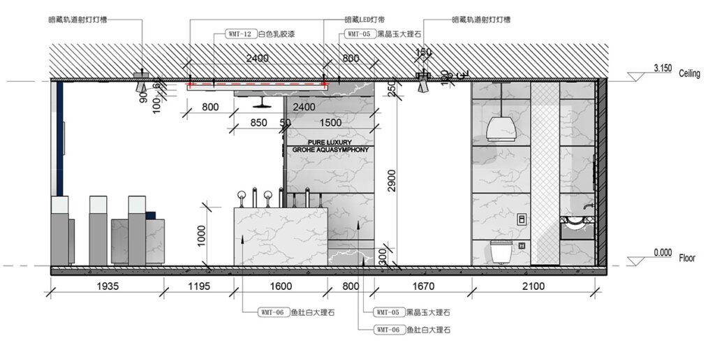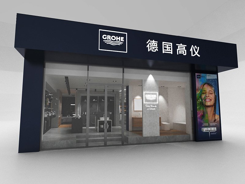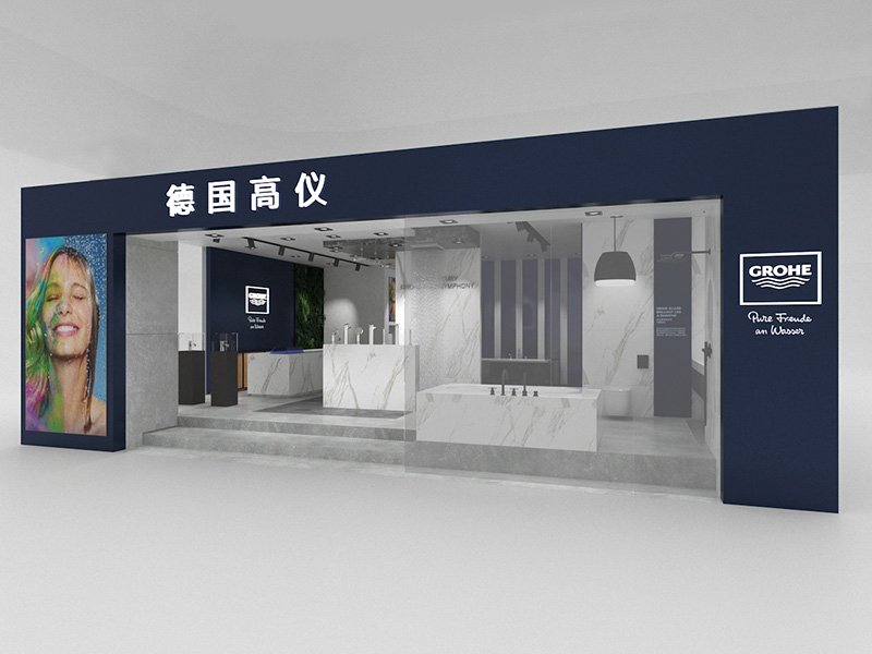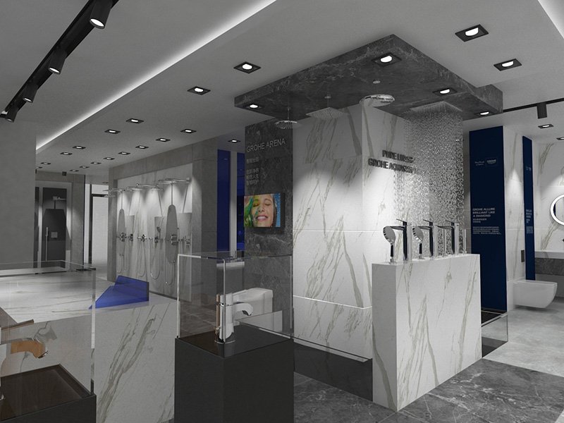The Huzhou GROHE flagship reimagines a 200 m² shell into a gallery of German water technology. A deep-navy rainscreen façade, fabricated from powder-coated aluminium cassettes, projects a crisp corporate silhouette; CNC-cut characters “德国高仪” and the framed logo are back-lit to create a floating night beacon. Behind low-iron, floor-to-ceiling glazing, a tiered, self-levelling concrete plinth guides visitors through zones that test faucets, shower systems and smart toilets. Carrara-vein porcelain slabs climb from floor to ceiling, forming monolithic display islands whose mitred joints read almost seamless. Overhead, a black track-lighting grid is pre-wired in the workshop and clipped into a hidden Unistrut sub-frame on site—reducing installation time and keeping the ceiling line clutter-free. All service pipes and data lines run in a raised floor void, allowing quick reconfiguration for new product launches. Sustainable elements include LED fixtures, water-recirculation rigs for live demos and VOC-free finishes, aligning precision construction with GROHE’s eco ethos.