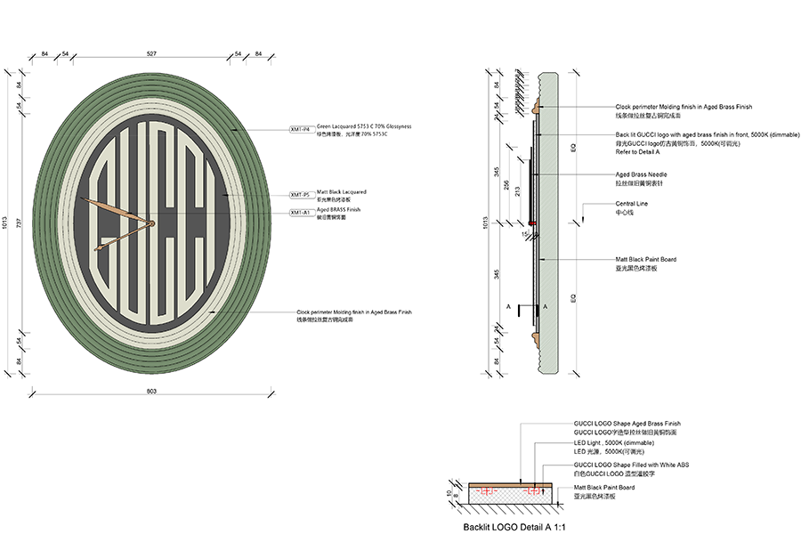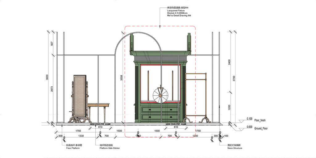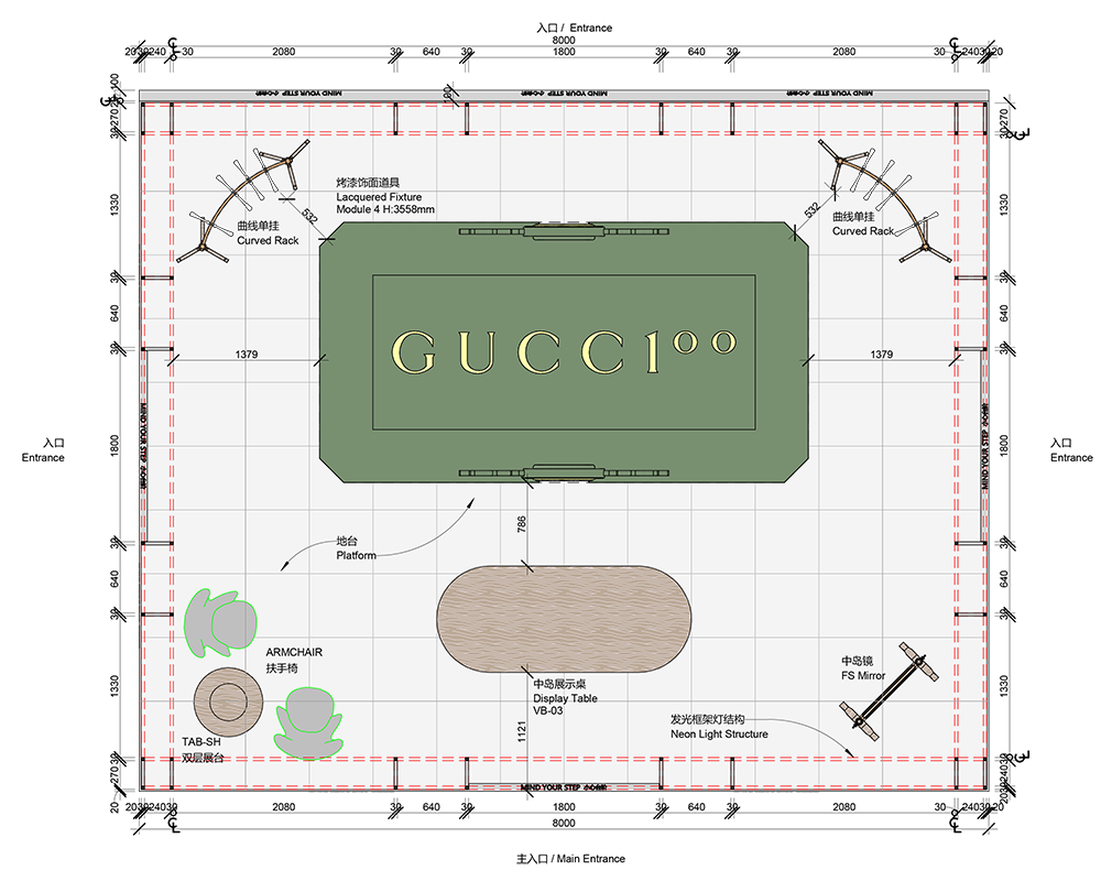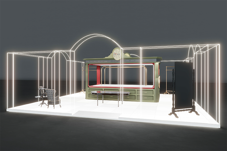 In the heart of Hong Kong’s luxury quarter, the Gucci 100 pop-up unfolds as a glowing pavilion that riffs on the city’s famous neon nights. A pristine white platform, lifted 100 mm above grade, is traced by a wire-frame of 5 000 K LED tubes that sketch arches, vaults and portals in pure light—suggesting architecture without enclosing it. At centre stage stands an oversized, heritage-green display cabinet with lacquer-red reveals, crowned by a gilded interlocking-G crest. Brass garment racks and carved ebonised mirrors flank the cabinet, while an oval timber table and brocade armchairs create an intimate try-on lounge. The restrained 6 × 6 m plan leaves generous negative space, allowing Hong Kong’s bustle to flow through the installation like a street market stall reimagined in couture marble. All elements mount to a lightweight steel deck for overnight assembly, ensuring zero impact on the mall slab. By evening, the luminous outline dissolves the boundaries between fashion set-piece and the city’s electric skyline.