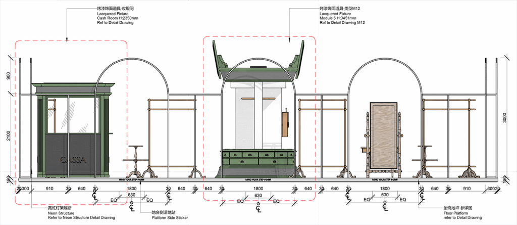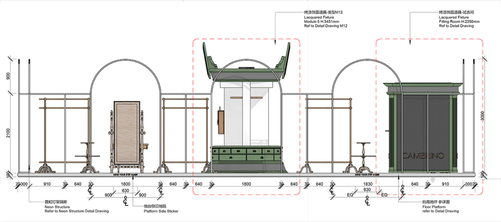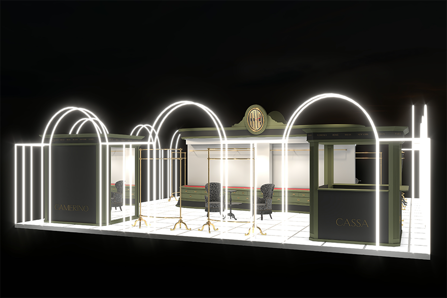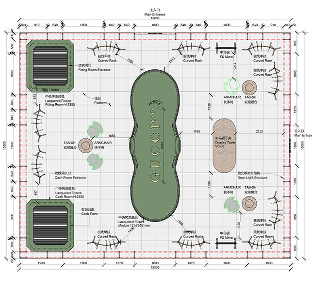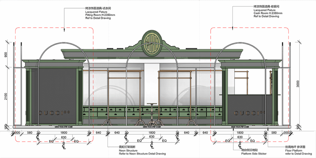 Inside Plaza 66 on West Nanjing Road, Gucci 100’s Shanghai edition reads like a miniature Bund promenade rendered in light. A 19 × 10 m porcelain-white platform floats 20 cm above the marble concourse, its perimeter traced by 3 m-tall LED arches that echo the mall’s barrel-vault skylights and Shanghai’s Art-Deco colonnades. At its heart sits an emerald-lacquer showcase sculpted in a sinuous, Huangpu-river silhouette—logo up-lit in dimmable 5 000 K white. Four corner pavilions (cash desk, twin fitting rooms and curated vignette) rise to 3 m with Florentine-green pilasters, rouge velvet drapes and brass grille medallions, referencing both Gucci heritage and the jade-and-vermillion palettes of nearby Jing’an Temple. Between them, brass garment racks and brocade armchairs invite tactile pauses, while a wheel-face neon clock nods to the famous Customs-House tower across the river. All components ride on a plug-and-play steel-bruss deck and UV-printed panels, enabling overnight build-out with zero impact on the mall slab—proof that Shanghai speed and Italian craft can dance in perfect sync.
