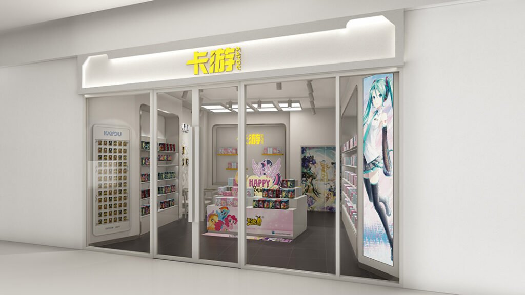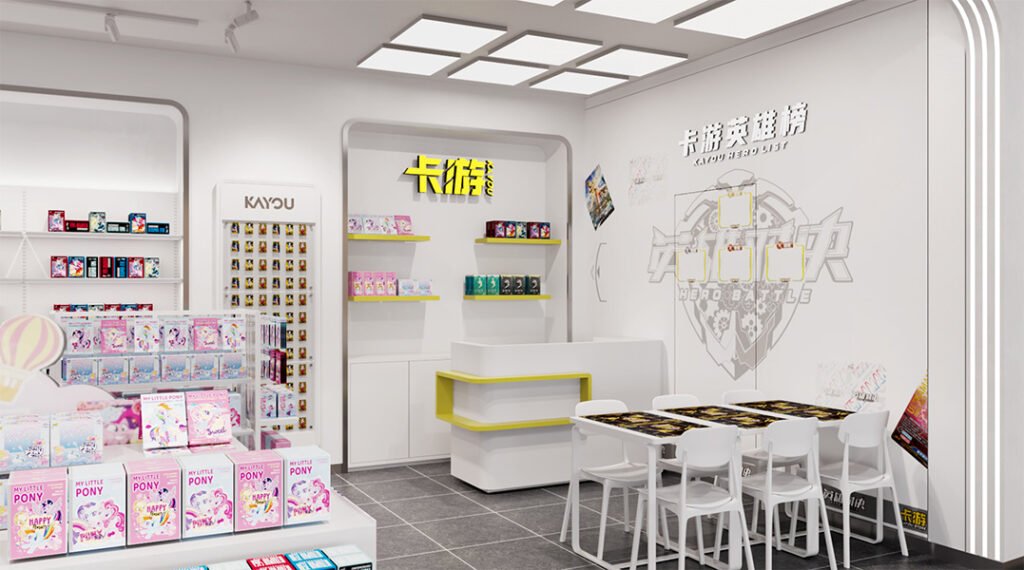 Bright white shell, neon-yellow branding, floating card gondolas and pop-art murals merge with a fold-away battle zone, giving Jieyang’s Kayou store gallery clarity and tournament-ready flexibility for trading-card fans.