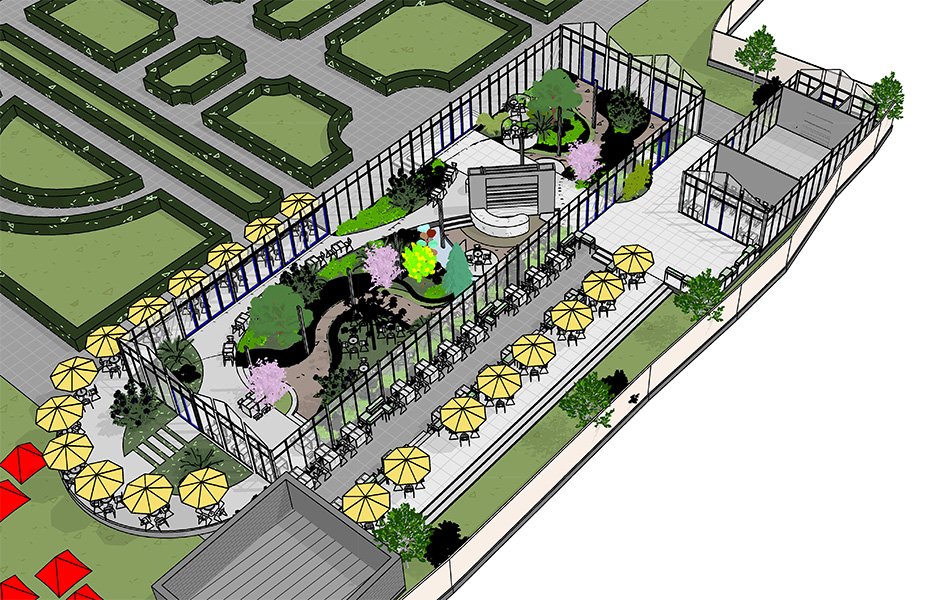 Two park-edge destinations: one nestles under venerable trees with sculpted lawns and sunken lounges; the other unfolds as a glasshouse ribbon where indoor garden paths meet a parasol-lined dining promenade.
