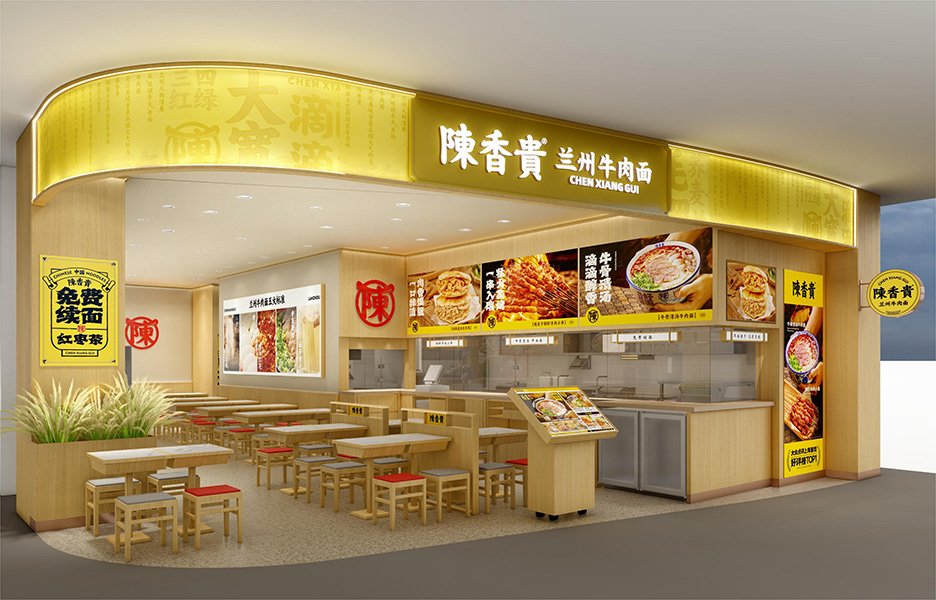 Delivered as a repeatable prototype, Chen Xiang Gui translates its hand-pulled-noodle heritage into a rigorously engineered interior. A luminous yellow fascia—perforated metal backed by programmable LEDs—signals the brand, while full-height glazing stages the theatre of cooking. Inside, every surface arrives as a dry-fit kit: ash-veneered acoustic panels lock onto an aluminium spine that conceals power, data, sprinklers and ducted HVAC; prefabricated stainless workstations slide beneath a single-piece quartz pass with factory-cut induction wells. Terrazzo-look SPC tiles float on a levelling cradle, allowing the entire floor to be swapped overnight without wet trades. Seating repeats the signature palette—marble-pattern tops, beech frames, red-grey upholstery—yet rides on hidden castors for rapid re-setting. Sound-absorbing ceiling coffers integrate LED down-lighting and fire services. The result is a dust-free build that compresses demolition, fit-out and commissioning into forty working days, delivering consistent brand DNA and predictable costs across street, mall or transit locations.