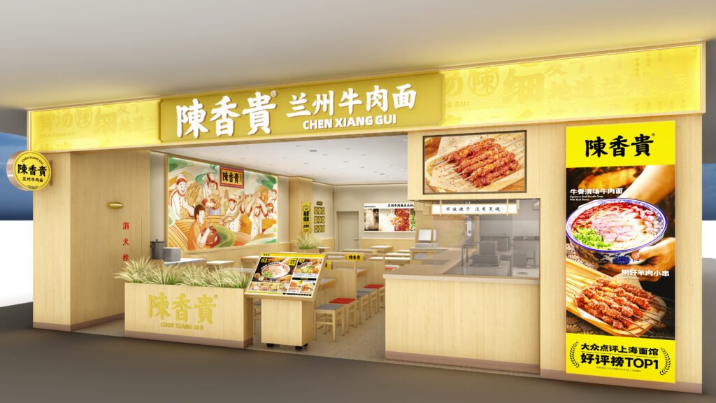 A luminous yellow fascia, plug-in ash panels and bolt-in stainless cooklines compress Chen Xiang Gui’s signature timber-and-quartz palette into an 80 m² inline store. Marble-look tables, colour-coded stools and terrazzo SPC flooring snap together for a three-week build, keeping the open kitchen spotless and the brand language instantly recognisable.