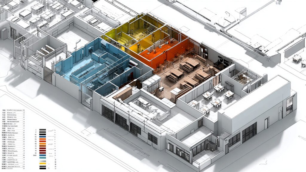 We create a live BIM model for test-fit layouts, adjacencies, and circulation paths—instantly checking area take-offs and code clearances.