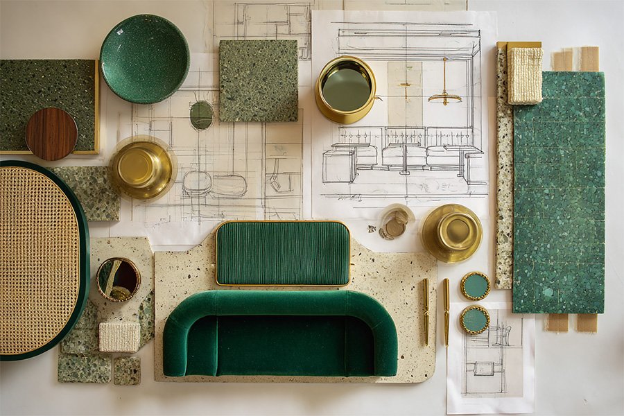 Story-driven mood boards translate brand values into colour, texture, and light. Early Revit views help verify proportion and rhythm.